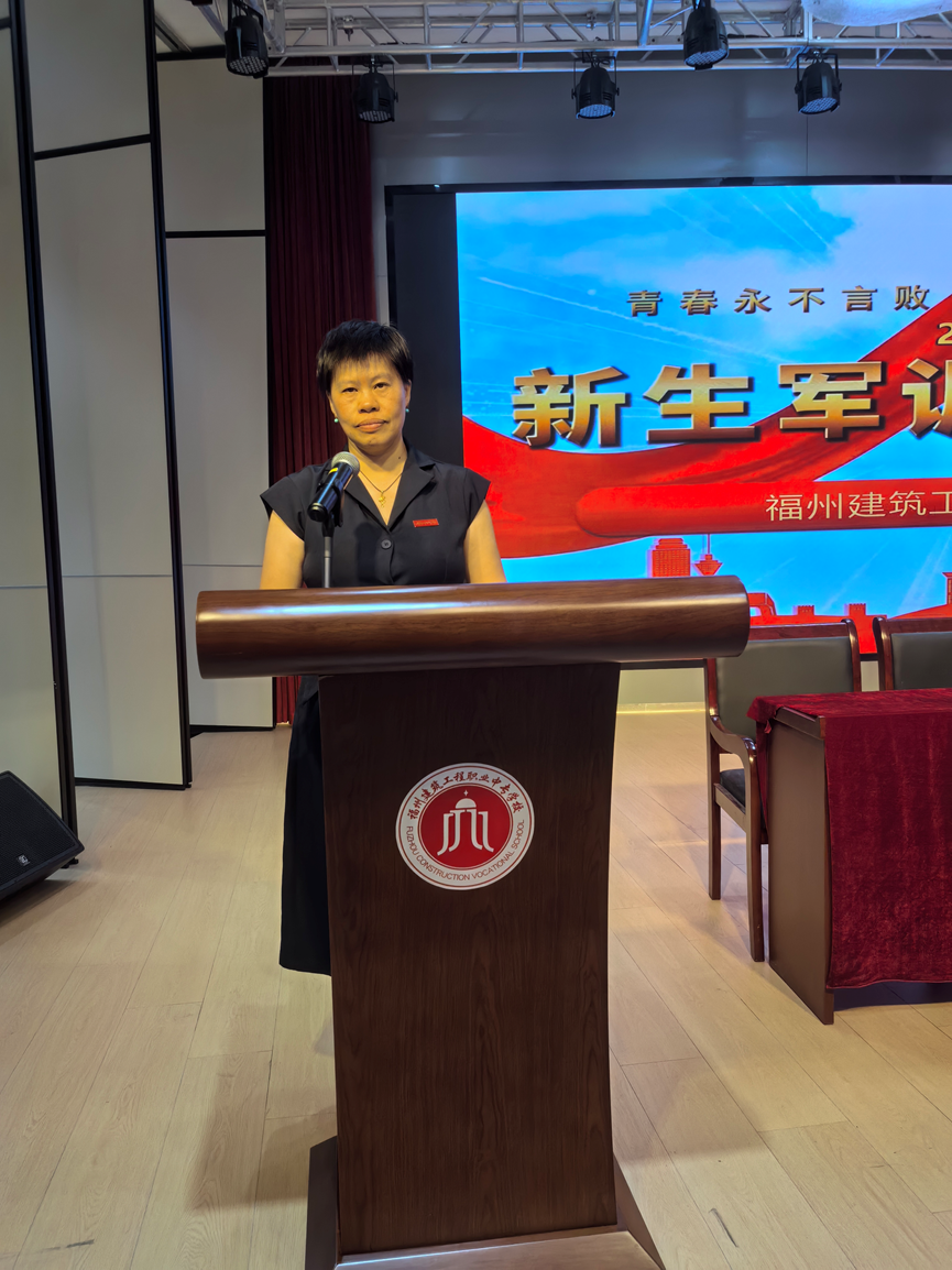 升国旗仪式后,蔡冠蓉副校长代表学校发表致辞。她强调,军训是新生校园生活的 “第一课”,不仅能锻炼体能,更能磨砺意志、塑造品格,也是强化国防观念、培养家国情怀的重要途径,号召同学们将个人成长融入国家发展大局。同时,对新生提出四点要求:端正态度迎接挑战、严守纪律听从指挥、团结协作共同进步、科学训练确保安全,蔡副校长的话语饱含关怀与期许,让新生们深刻认识到军训不仅是体能的锻炼,更是精神的洗礼与品格的塑造。