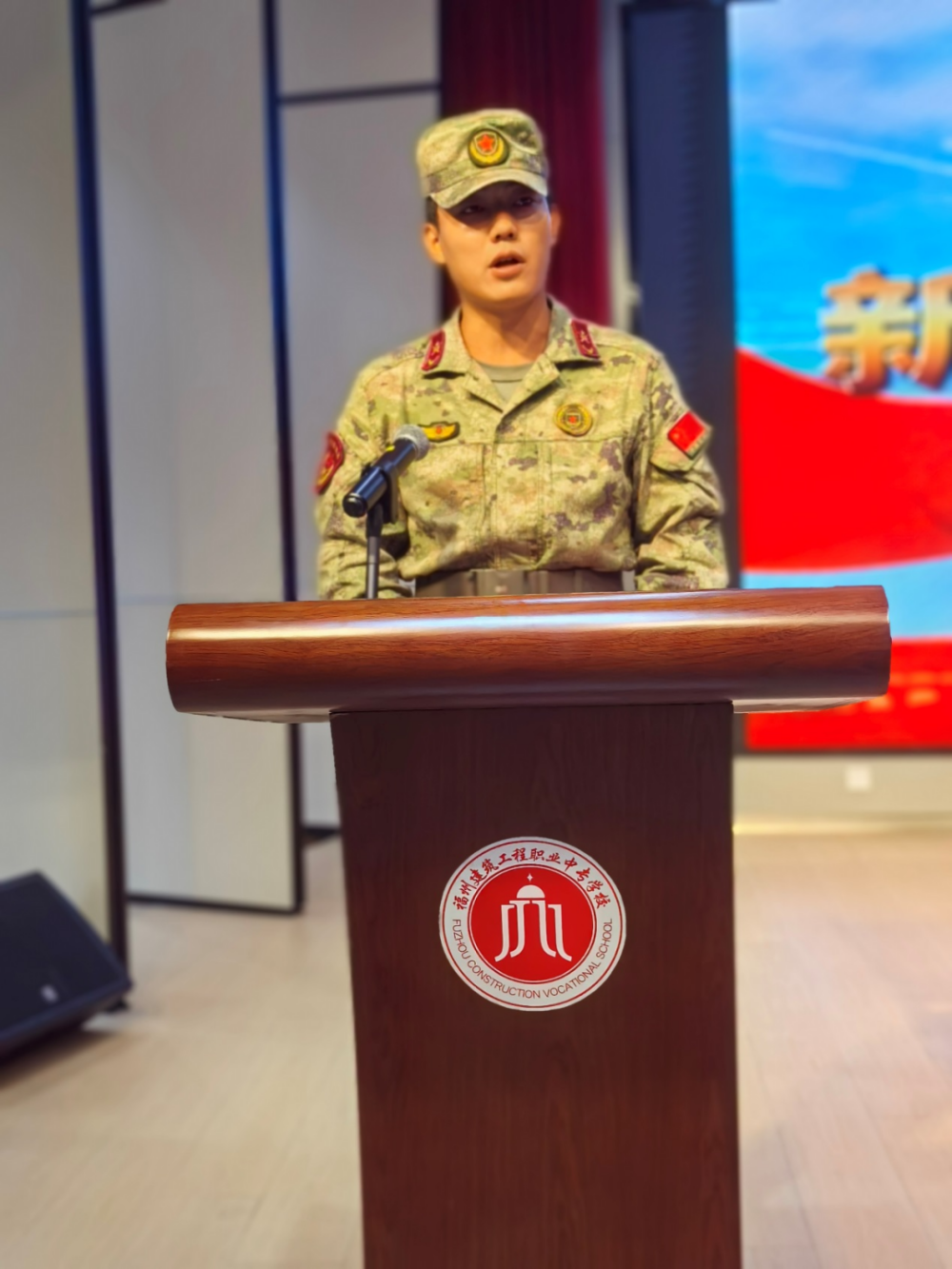 紧接着,郑承童总教官代表全体军训教官发言。他承诺将以专业的军事素养、严谨的训练态度,科学制定训练计划,既严格要求新生完成训练任务,也会耐心指导、关心关爱每一位同学。同时,他鼓励新生们要拿出 “不怕苦、不怕累” 的劲头,在军训中学会坚持、学会担当,真正展现新时代青年的精神风貌。