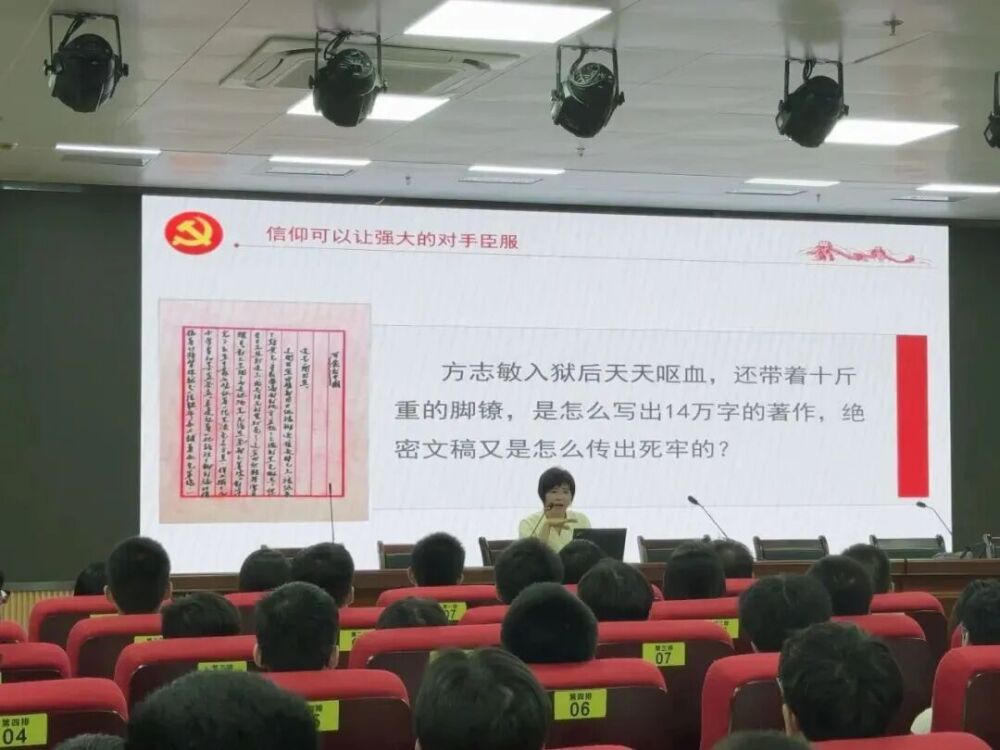 从方志敏将名字中的“敏”字作为新婚礼物,寓意“你中有我,我中有你”的浪漫,到被捕后,两人被关押在仅相距800米却始终无法相见,并共同断然拒绝敌人以投降为条件的见面机会……这段故事让在场的同学无不动容。方志敏那句“我只有抛下他们”,与缪敏默契相同的选择,完美诠释了“信仰如何升华世界上最伟大的爱”。这种爱,超越了儿女情长,铸就了顶天立地的革命灵魂。