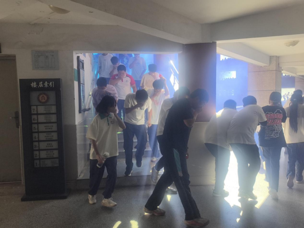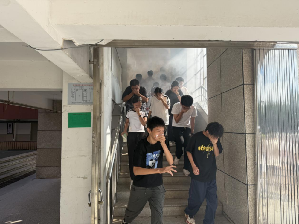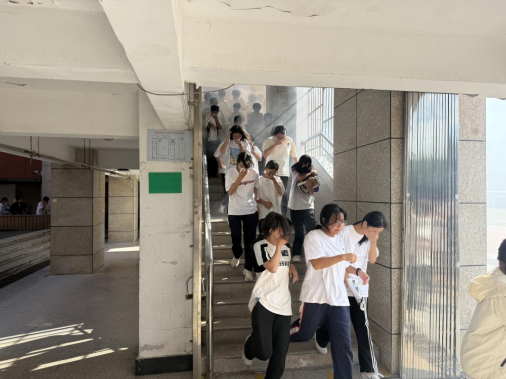 下午14时45分,模拟火灾警报声准时响起,各班级班主任迅速组织学生用湿毛巾捂住口鼻,沿着预定疏散路线弯腰快速前进,有序撤离至操场指定安全区域。整个疏散过程仅用时1分58秒,无拥挤、无推搡,全体师生安全到位。