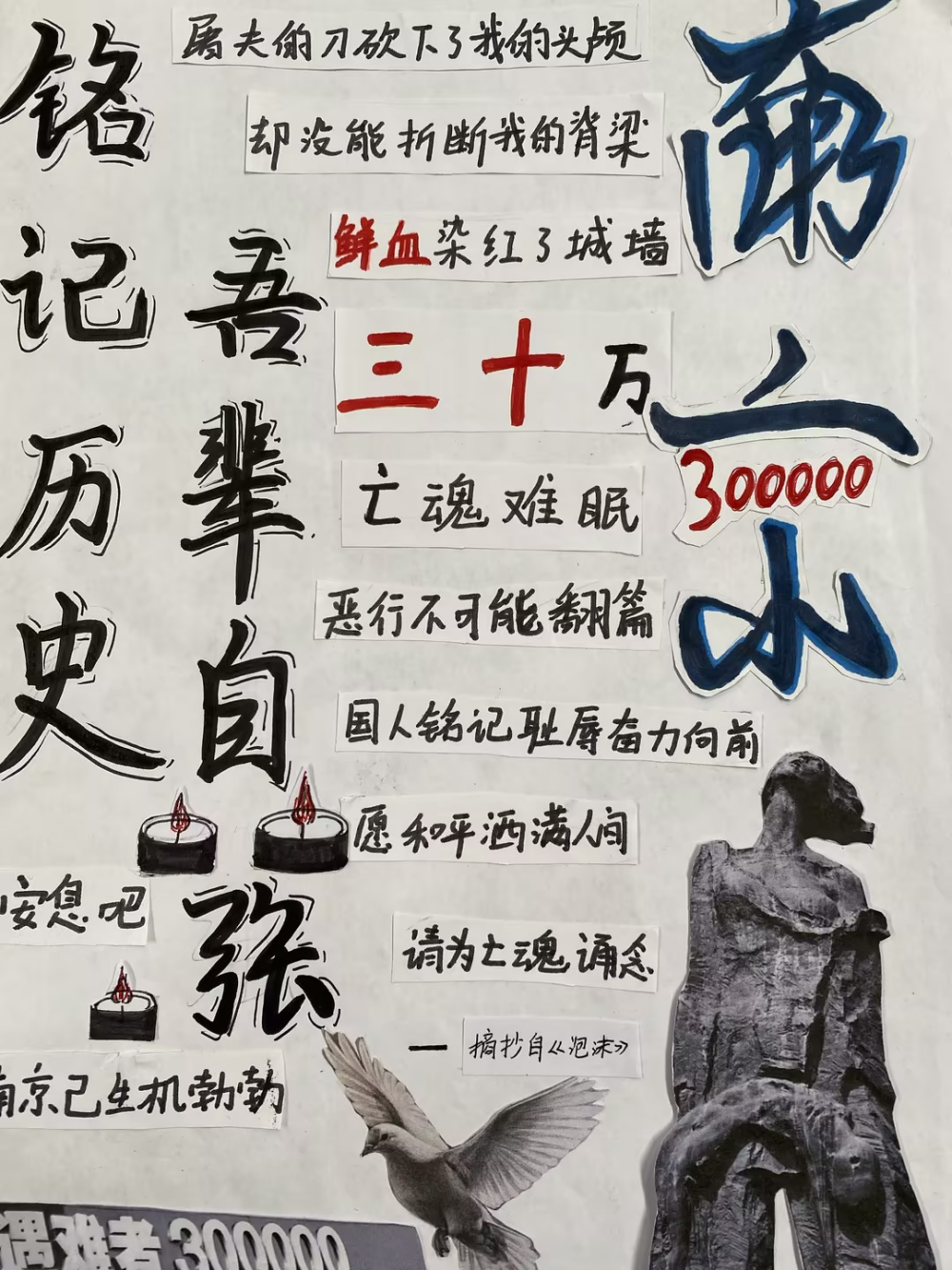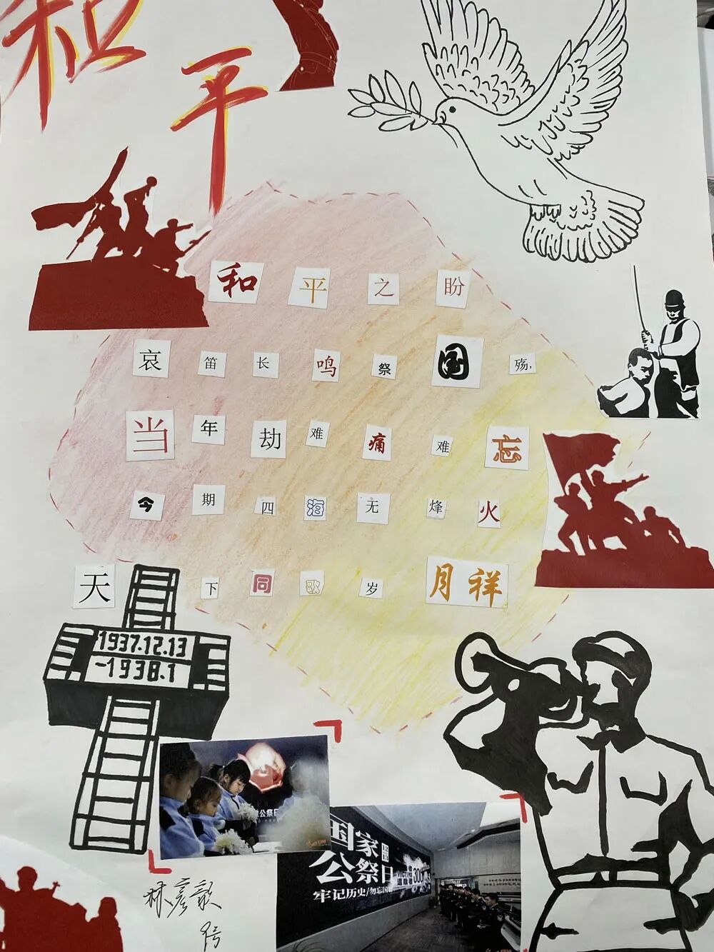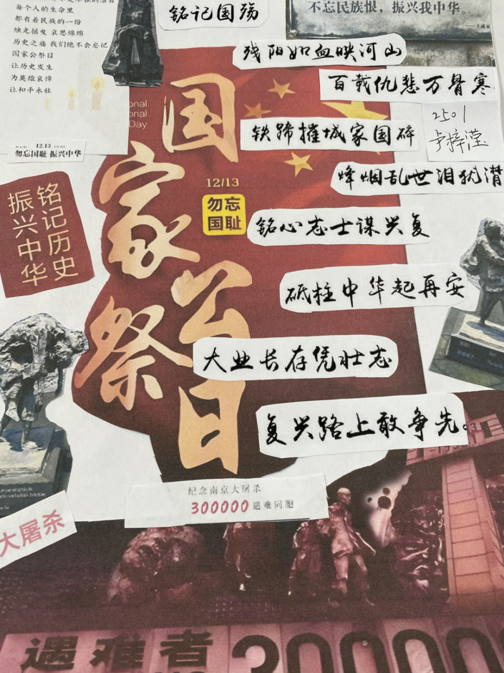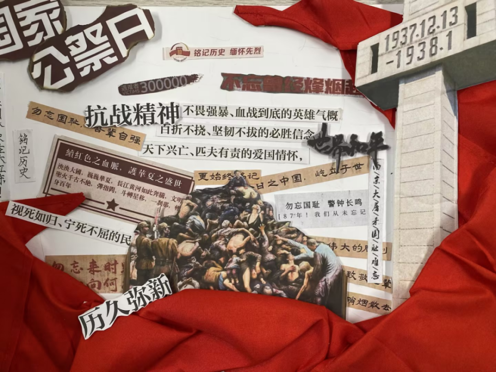 一张张作品,皆是一份份赤诚的纪念。有的同学选用厚重的红色卡纸作底,让每一个字句都浸染着赤诚的底色,仿佛从历史深处走来,叩击着观者的心扉;有的同学搭配简笔线条,将 “和平鸽” 与诗句相融,传递对安宁的珍视;还有同学别出心裁,点缀上红色领巾作为装饰,让作品更具青春的担当与敬意。这些作品不仅展现了同学们对语文文本的解读与重组能力,更让“国家公祭日”的记忆,从课堂上的知识,变成了可触摸、可感知的情感表达。
