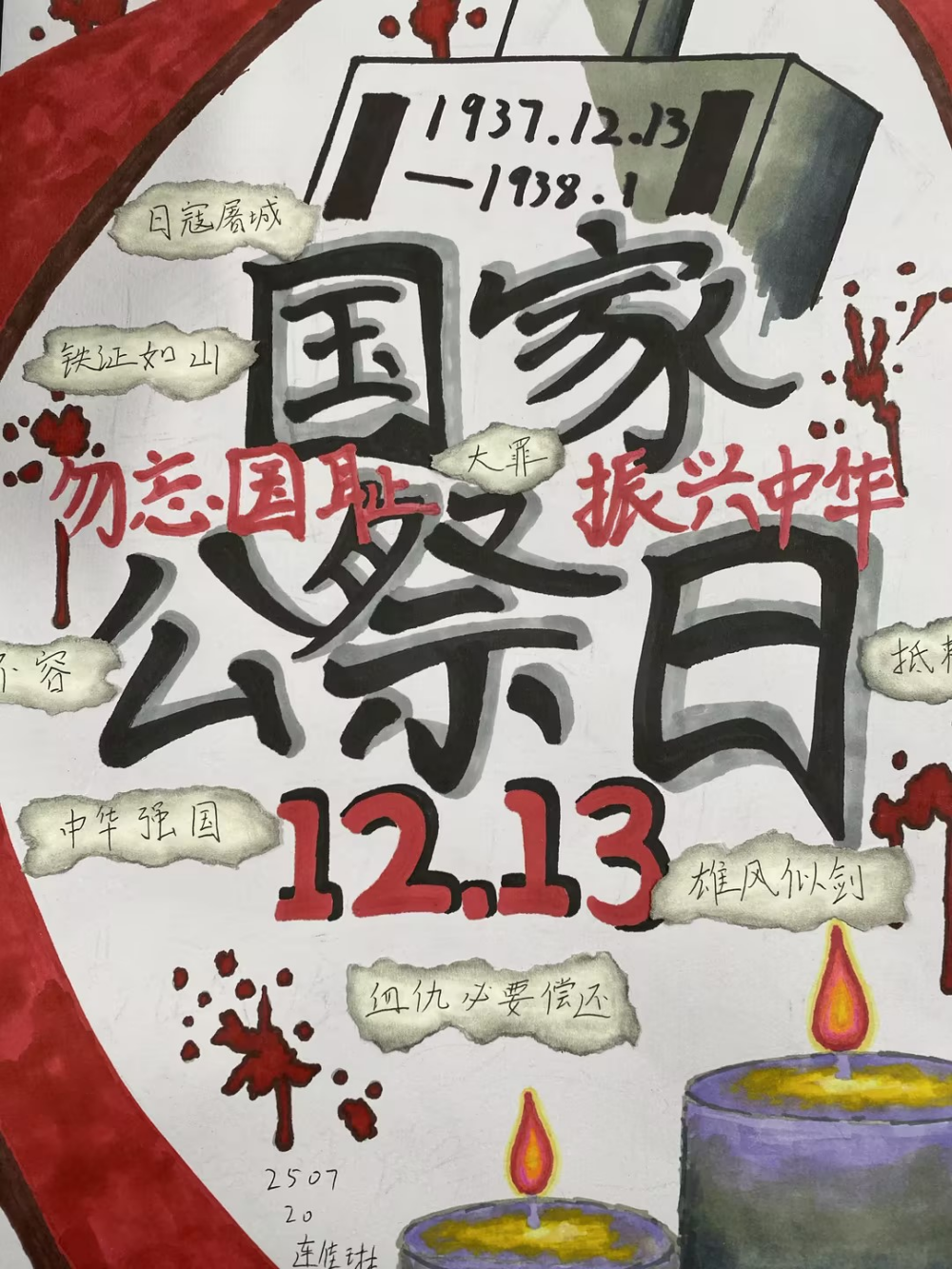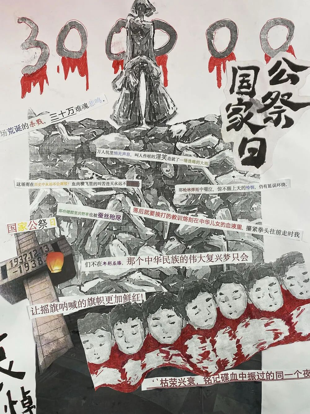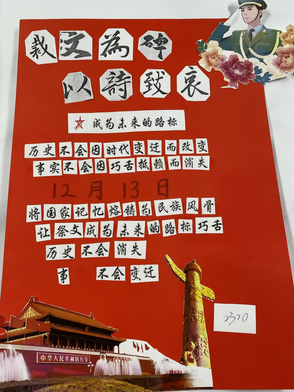 一张张作品,皆是一份份赤诚的纪念。有的同学选用厚重的红色卡纸作底,让每一个字句都浸染着赤诚的底色,仿佛从历史深处走来,叩击着观者的心扉;有的同学搭配简笔线条,将 “和平鸽” 与诗句相融,传递对安宁的珍视;还有同学别出心裁,点缀上红色领巾作为装饰,让作品更具青春的担当与敬意。这些作品不仅展现了同学们对语文文本的解读与重组能力,更让“国家公祭日”的记忆,从课堂上的知识,变成了可触摸、可感知的情感表达。