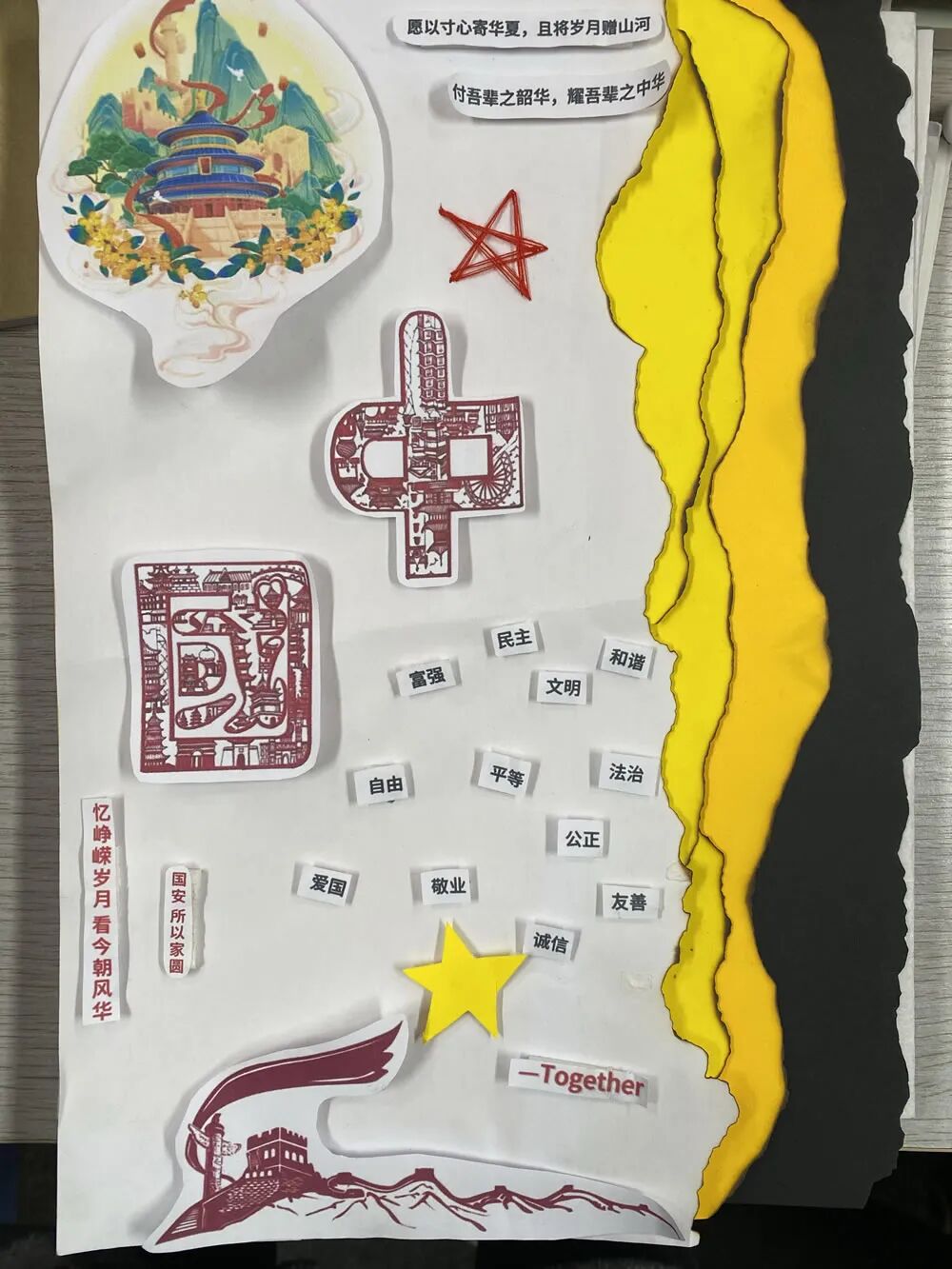 历史的记忆,需要代代相传;家国的情怀,需要点滴滋养。此次拼贴诗实践活动,不仅是一次生动的语文实践课,更是一堂深刻的爱国主义教育课。未来,语文组将继续探索更多融合文化与情怀的实践形式,让同学们在文字的世界里,读懂历史、坚定信仰,让家国情怀在心中深深扎根。