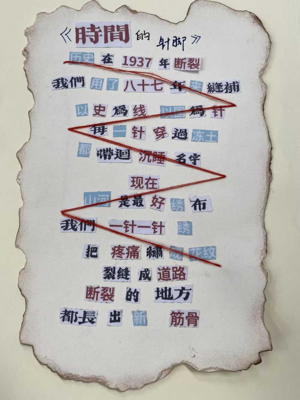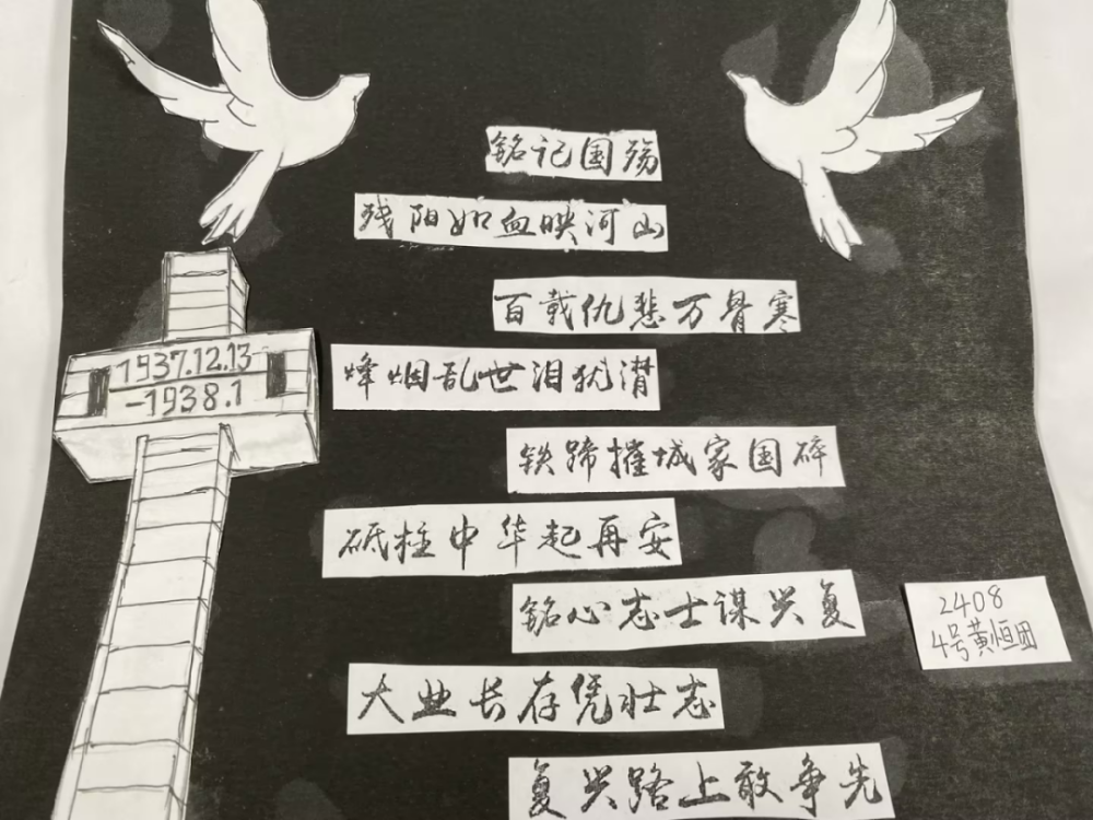书页轻翻,是与历史的对话;剪刀起落,是对和平的礼赞。近日,我校语文组发起的“裁文为碑,以诗致哀”国家公祭日拼贴诗实践活动圆满落幕。各班级同学踊跃参与,用一张张承载心意的拼贴诗作,将对历史的敬畏、对家国的深情,凝练成了字字动人的纪念篇章。