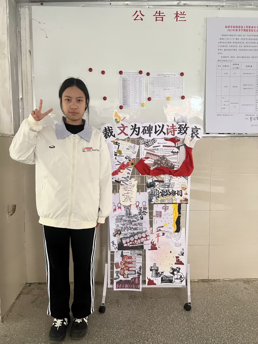 如今,相关专属展板已正式亮相,数幅优秀拼贴诗作品整齐陈列,成为校园里一道承载着历史重量与青春温度的风景线。驻足展板前,能看到字句间流淌的家国情怀:“以‘山河’起笔,用‘坚守’承托,最后落于‘和平’,是想告诉先辈,他们守护的土地如今安稳如常”。同学们的创作心意,藏在每一处剪裁与排布里,让每一位观览的师生都深受触动,在静默中与历史对话,在诗行间体悟和平的珍贵。