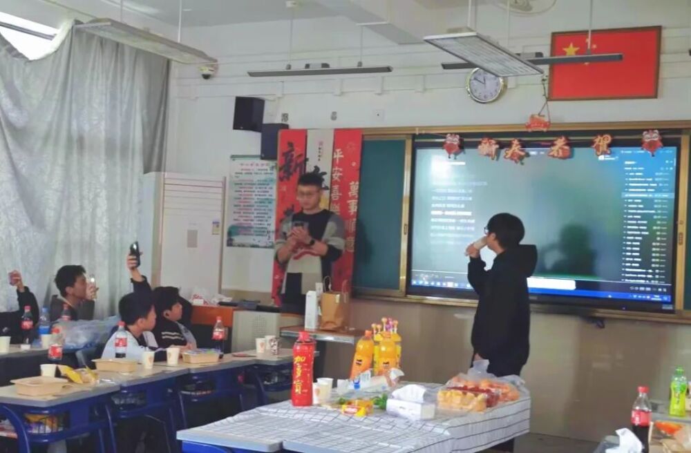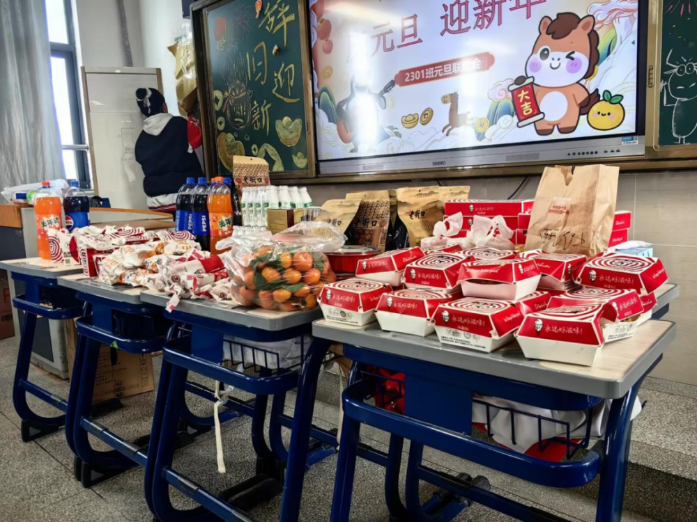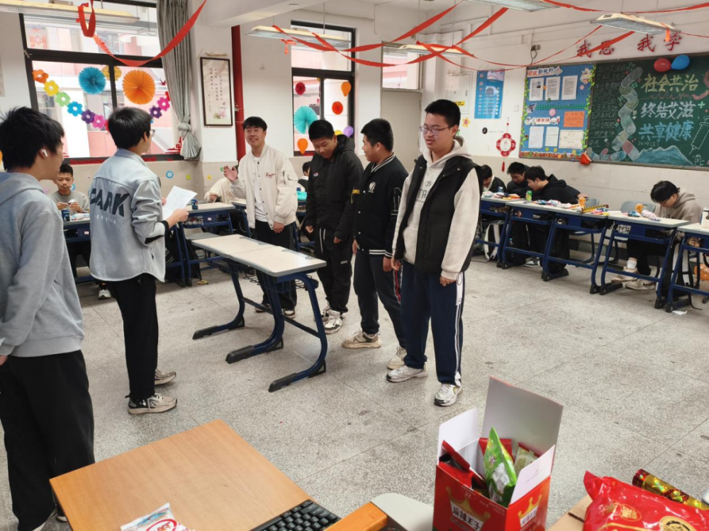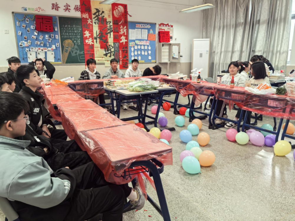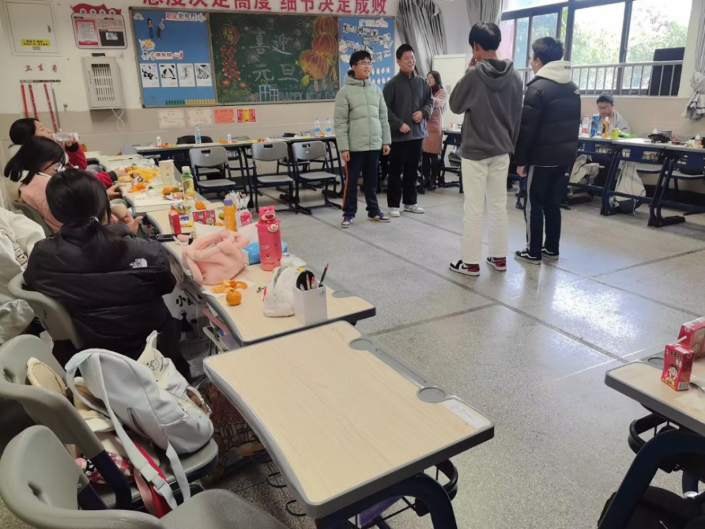 活动前期,各班级师生携手开展布置工作,将教室装点得年味十足。五彩斑斓的气球悬挂半空,红彤彤的灯笼与中国结相映成趣,墙上张贴着同学们亲手绘制的元旦主题手抄报和新年寄语,每一处细节都饱含着对新年的期盼。班主任与家委会成员全程协助,确保布置工作安全有序,同时提前明确活动后恢复教室原貌的要求,培养同学们的责任意识。家委会精心筹备了各类冷盘、熟食,同学们也纷纷带来自备的甜品与零食,与同学分享,与老师共品。