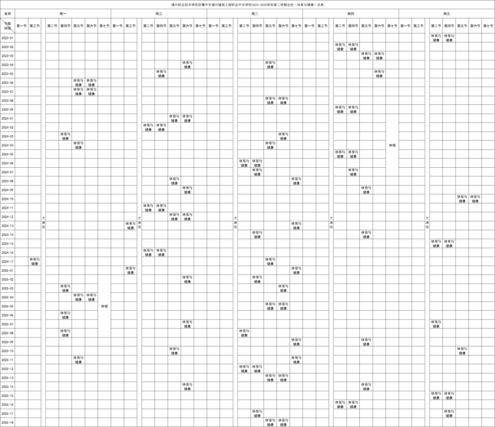 根据《福州市教育局关于进一步加强全市中小学体育“四项管理”的通知》(榕教综〔2024〕3 号)要求,为进一步做好我校体育教育教学,推动我校体育工作向更高质量发展,现将福州建筑工程职业中专学校 2025-2026学年第二学期体育与健康课表公示如下: