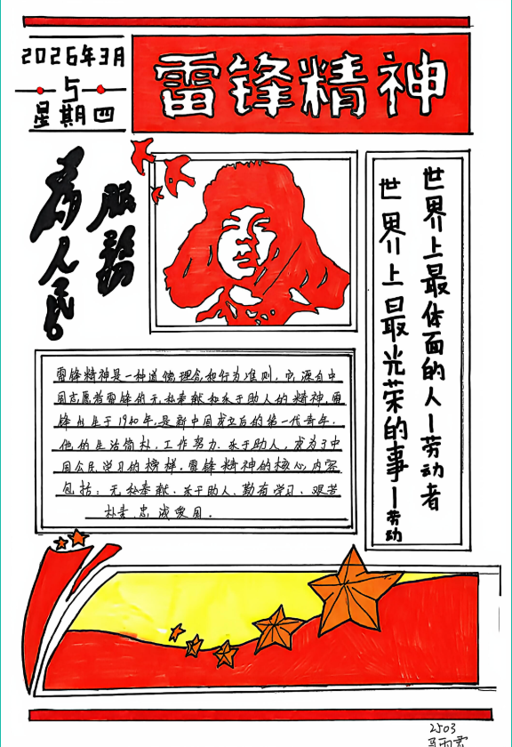 “笔尖传情,续写雷锋故事”主题征文及手抄报比赛——以文传志,以画传情,让雷锋精神永放光芒。为进一步深化雷锋精神学习教育,丰富活动形式,我校同步开展此次比赛,为同学们搭建了表达敬意、传递温暖的平台。活动启动后,同学们积极响应、踊跃参与,纷纷拿起笔杆、挥动画笔,将对雷锋同志的崇敬之情、对雷锋精神的理解感悟,融入字里行间、定格在画卷之上。