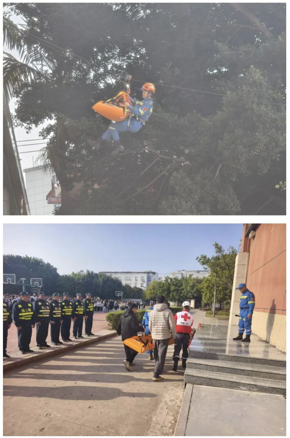 点评结束后,蓝豹救援队队员为全体学生展示了高空索降解救“被困人员”实操演练。队员们专业的操作、默契的配合,生动展现了高空救援的流程和技巧,让学生们直观了解了专业救援的方法,增强了对紧急情况下救援工作的认知,也进一步提升了自身的安全防范意识和应急处置能力。