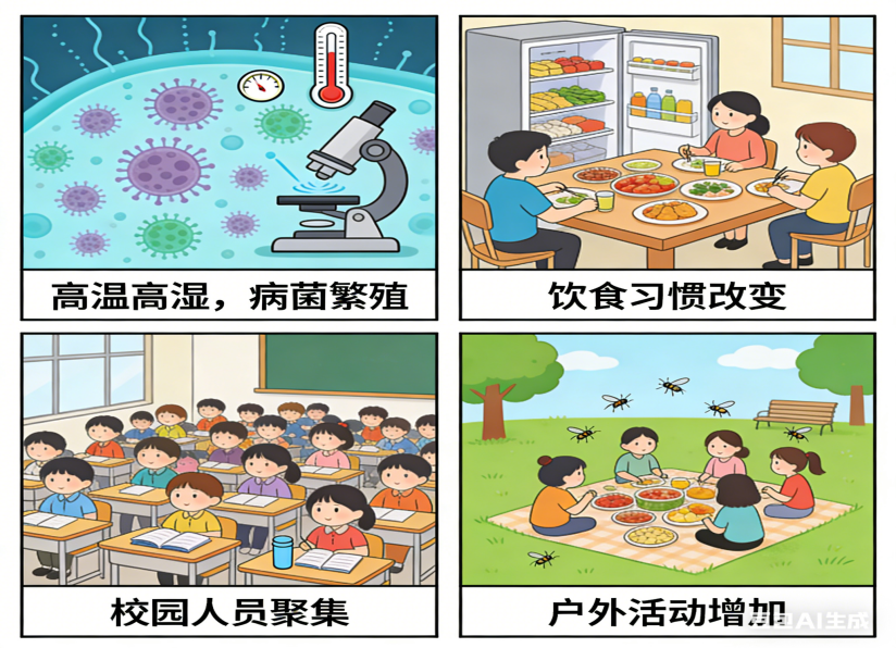 1、气温适宜:春夏季气温多在 20℃—35℃,湿度较高,大肠杆菌、诺如病毒、沙门氏菌等致病微生物极易在食物、水源、餐具上快速滋生,繁殖。