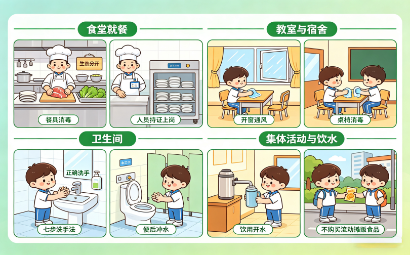3、校园聚集性风险突出:教室、食堂、卫生间、宿舍等场所人员密集,若卫生习惯不佳、消毒不到位,极易出现聚集性发病。