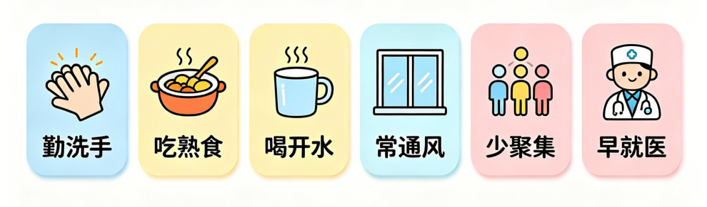 ⭐早就医:一旦出现呕吐、腹泻、发热等症状,立即报告老师、及时就医,痊愈后再返校。
